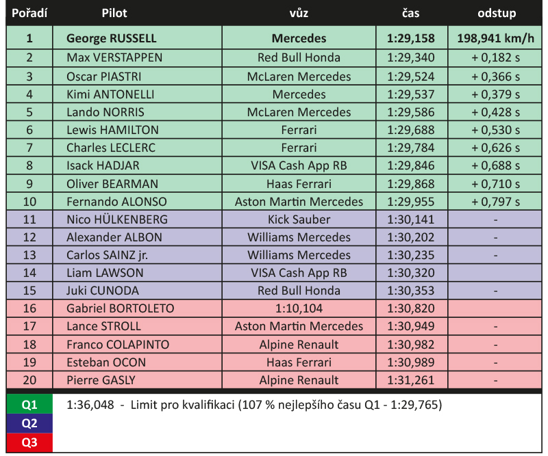 Nejlepší čas zajel překvapivě v samotném závěru Hamilton (1:29,765), Bortoleto a Colapinto v posledním rychlém kole vyrobili drobné chybičky a Gabriel ztratil na Albona 0,045 vteřiny. Tím se uzavřela první část kvalifikace a maršálové se vrhli na Gaslyho vůz, aby ho dopravili do bezpečí, takže Q2 se o několik minut zpozdila.